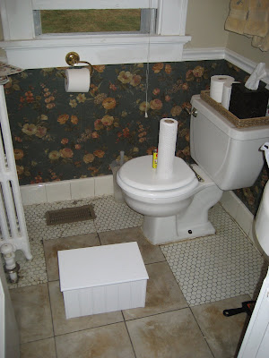 This is the current condition of our powder room. When we moved in I knew we would eventually remove the wallpaper (duh?!) but this project, like so many others, was on a very long to-do list. While cleaning the floor last week one of the tiles came loose and I noticed the fantastic original tile underneath. I couldn't resist, so I ripped up another tile then another...and so on. And now my bathroom looks like this. At first glance, I know this seems like a small "home improvement" project. But it is ridiculously difficult and time consuming to remove the glue underneath each tile. Did I mention that it is time consuming? And awful? I've set a "tile removal deadline" of Oct. 24. (This also happens to be Kevin's birthday. Perhaps I can make a cake in the shape of a toilet? How festive!) I'll tackle the walls next. Then the fixtures. To be continued...